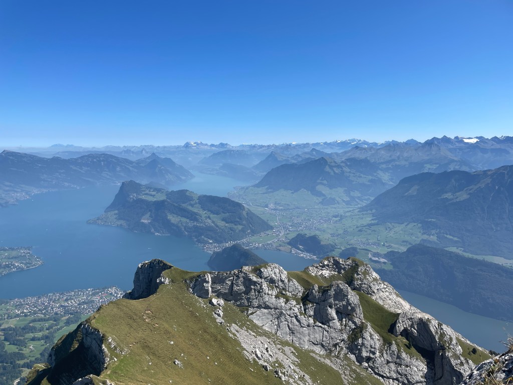 Once you get to the top, there isn’t much hiking from what I remember. There are a handful of viewpoints to check out, tables to eat at, food and souvenirs to purchase, and a nice hotel! You’ll have magnificent views all around, such as Lake Lucerne and Mount Rigi to the east, and the Bernese Alps to the south.